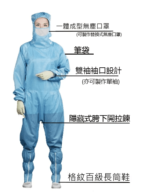(中開)連身連帽衣使用在無塵等級一千到一萬之間。