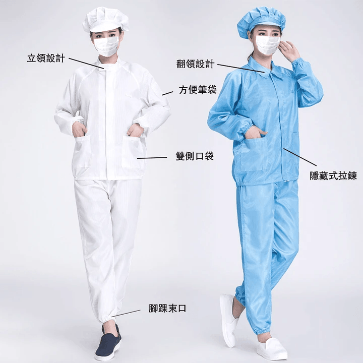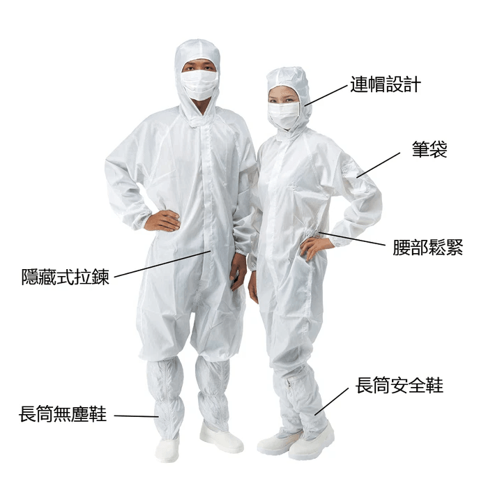 材質特性可防止顆粒污染、抗靜電、低微粒子、耐水洗、舒適透氣。
