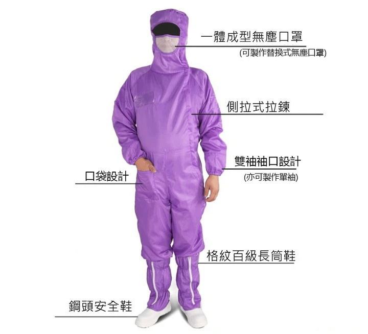 - 大量現貨、加大尺碼無塵衣供應。